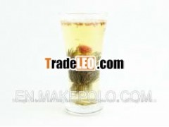 Blooming Tea, or flowering tea/art tea, is madefrom green tea silver needle, and beautiful, natural flowers. Withtheir dexterous fingers, our skilled artists carefully hand tiejasmine green tea leaves around the natural flowers. Then the teaballs come forth.